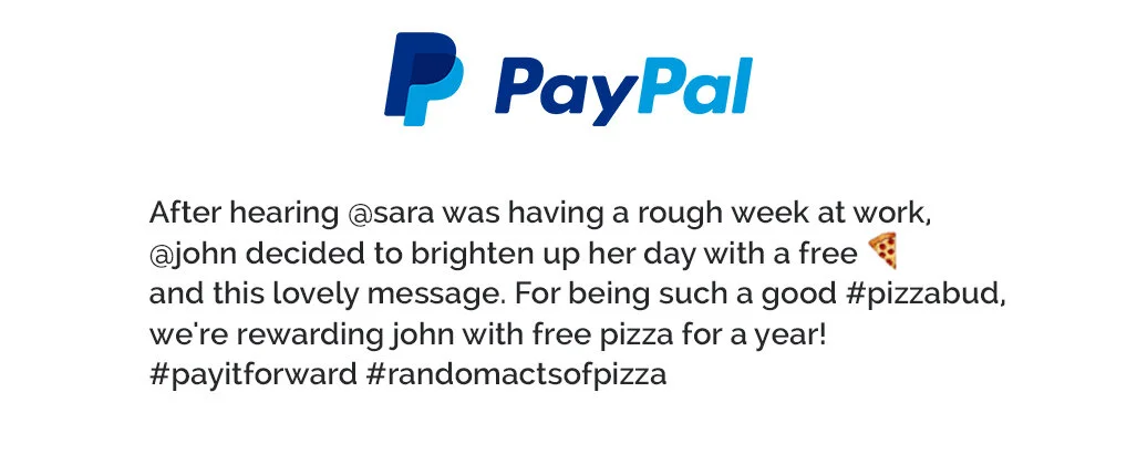 Customers who ordered a pizza from Domino’s and paid using PayPal were redirected to a form where they entered their buddies information to send a free pizza voucher along with their own personal message. This became a way for PayPal and Domino’s to generate new clients, while at the same time building long-term relationships with their customers.